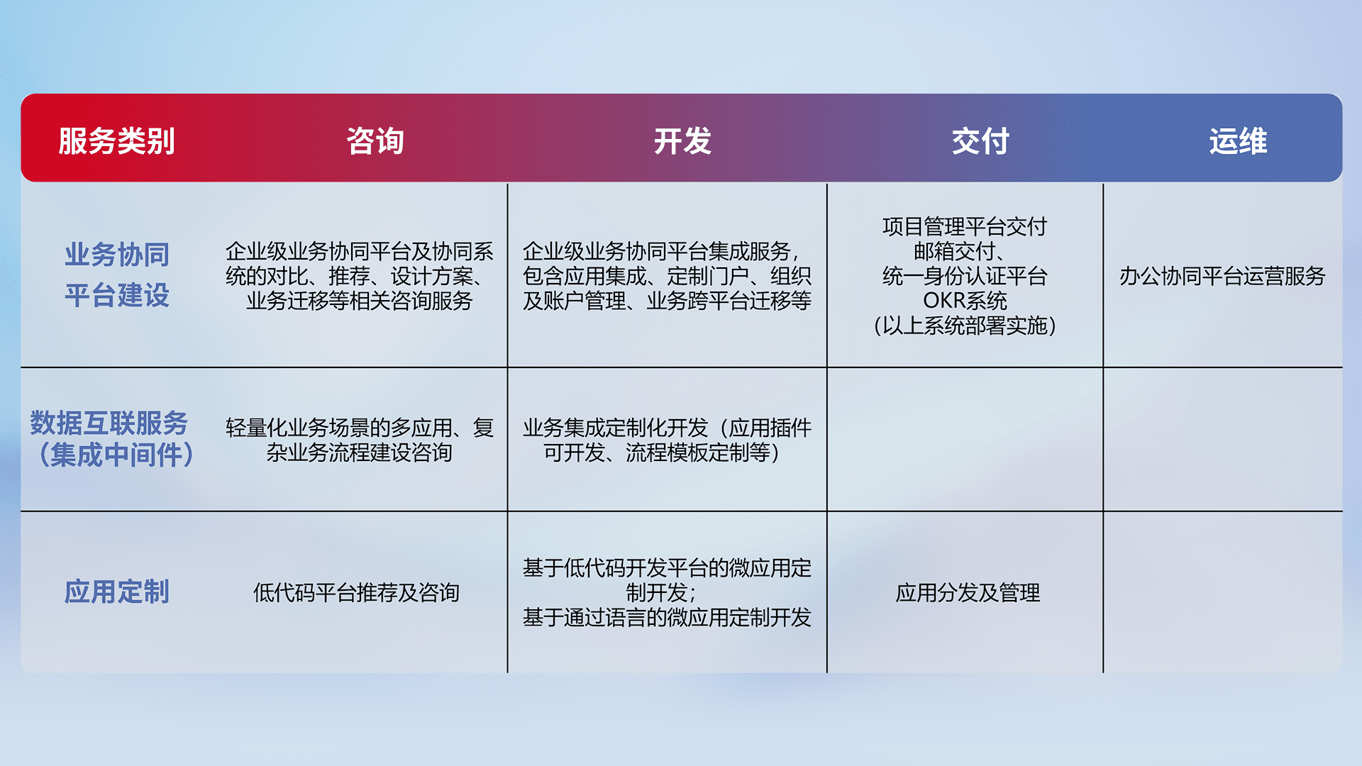 针对钉钉、、、、企微、、IDaas等平台级产品提供产品的规划、、方案、、、、交付、、定制化开发等服务,,实现如统一协同办公、、智能客户服务、、、、混合会议管理、、、、智能数据查询、、、、等业务场景,,实现数字化转型。。。。